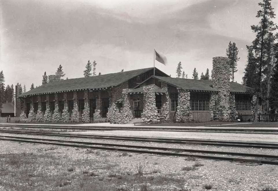 Although not technically a lodge, the West Yellowstone Dining Hall was celebrated as a triumph of rustic design. Completed in 1925, it was built of local rhyolite stone, local peeled and unpeeled logs, and red fir bark slab siding, Union Pacific Museum Collection.